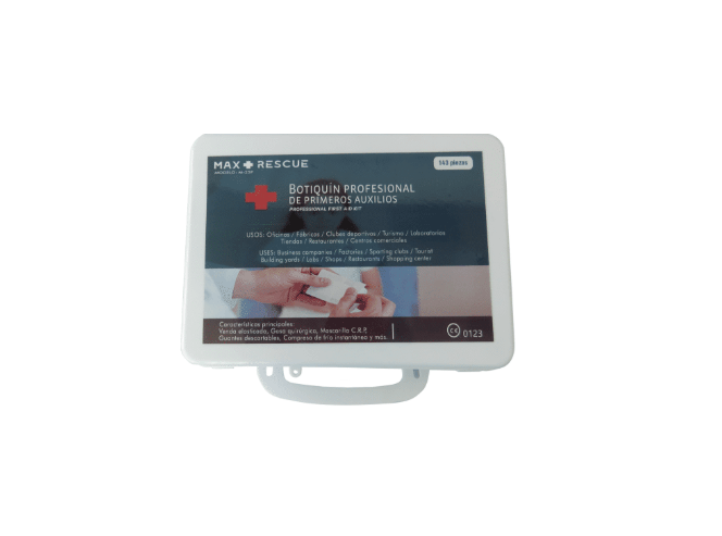 - Contenido del botiquín: 1 Venda triangular, 75 Vendas adhesivas, 1 Almohadilla combinada, 10 Compresas de gasa estéril (5 × 5 cm), 5 Compresas de gasa estéril (7.5 × 7.5 cm), 1 Bolsa de frío instantáneo, 2 Correas para torniquete, 2 Vendas de PBT, 2 Máscaras descartables para RCP, 2 Apósitos para ojos, 1 Tijera, 2 Cintas microporosas, 10 Hisopos antisépticos BZK, 2 Bolsas de algodón, 15 Alfileres de seguridad, 1 Folleto de primeros auxilios, 4 Guantes de PVC, 2 Toallas húmedas, 4 Mantas de emergencia y 1 Caja organizadora de primeros auxilios